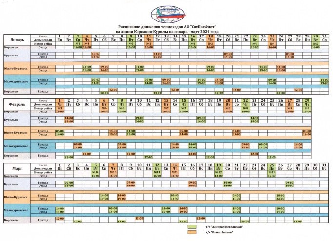 Утверждено расписание движение на 2024 год теплоходов «Админрал Невельской» и «Павел Леонов» на Курильские острова. Перевозчиком АО «Сахалинский пассажирский флот» перевозка пассажиров и грузов будет осуществляться круглогодично из портов Корсаков, Южно-Курильск, Курильск, Малокурильское.